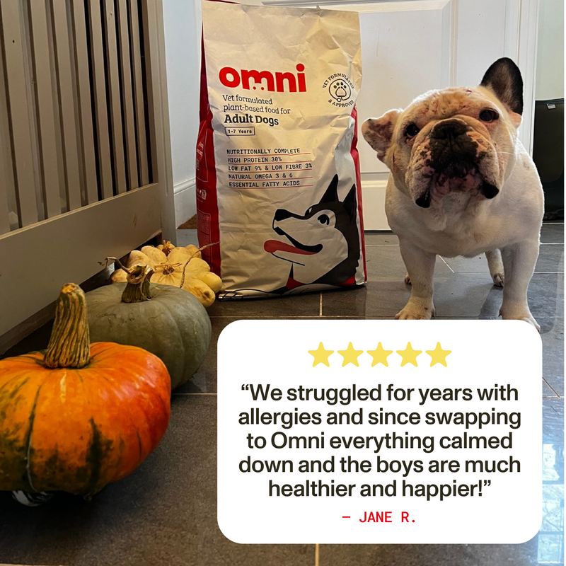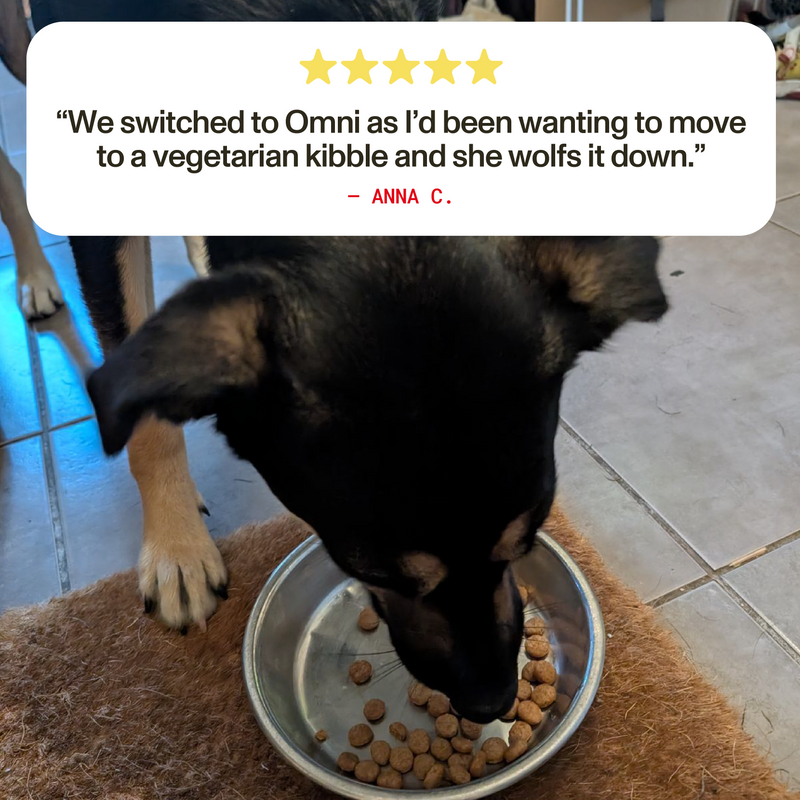 Bring more joy to mealtimes with food your dog will love - excited tails, clean bowls, and playful energy included. Omni Adult Dry Food gives you peace of mind by easing common sensitivities like itchy skin, sore ears, or upset tummies. And because free from common allergens like chicken, beef, and dairy, you know every bowl is good for your dog, good for animals, and good for the planet.