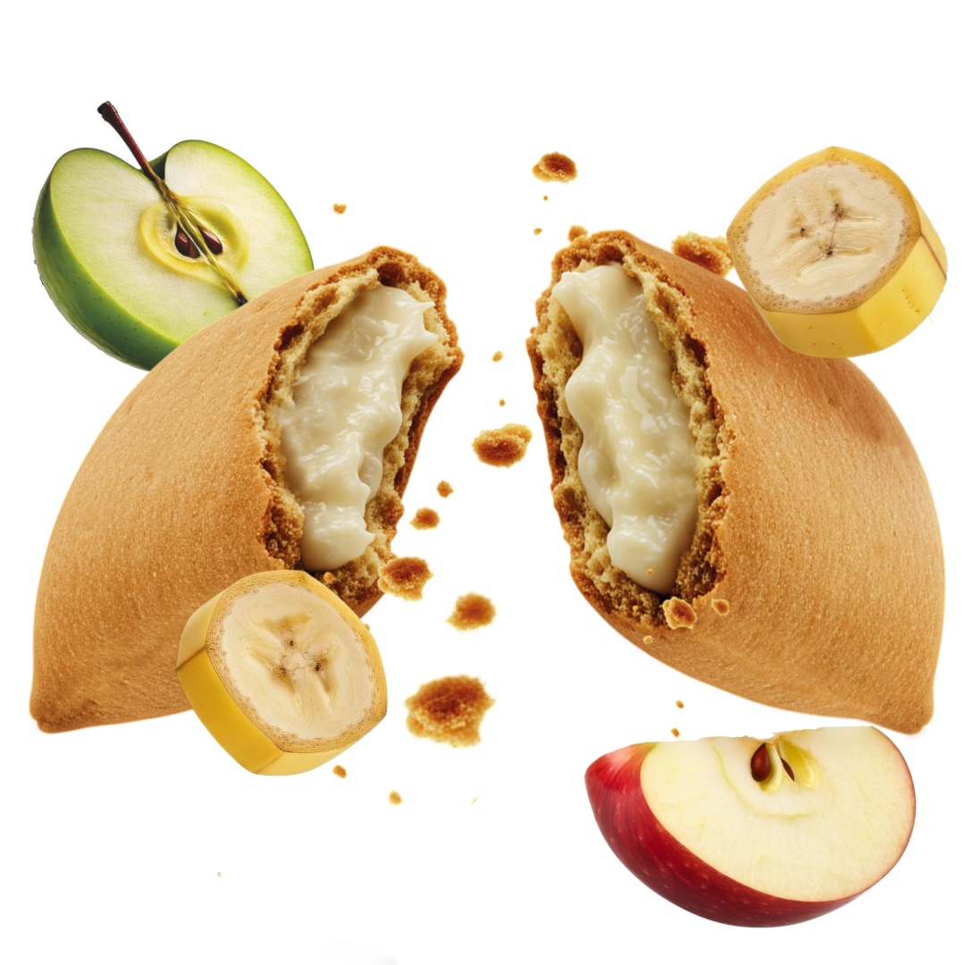 Each bite is lovingly crafted without common allergens like chicken, soya, or grain but bursts with flavour from a delicious apple and banana soft-centred filling.